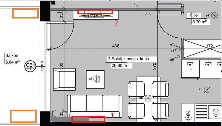 wersja 1 ( nad kanapą ) lub wersja 2  (naprzeciw) ,   odlogłość scian ~ 4 metry .