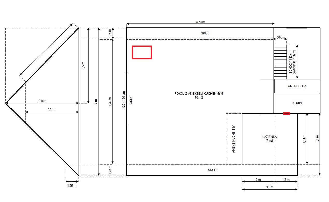 Poniżej schemat pomieszczeń z oznaczeniem na czerwono klimatyzatora i kratki wentylacyjnej: