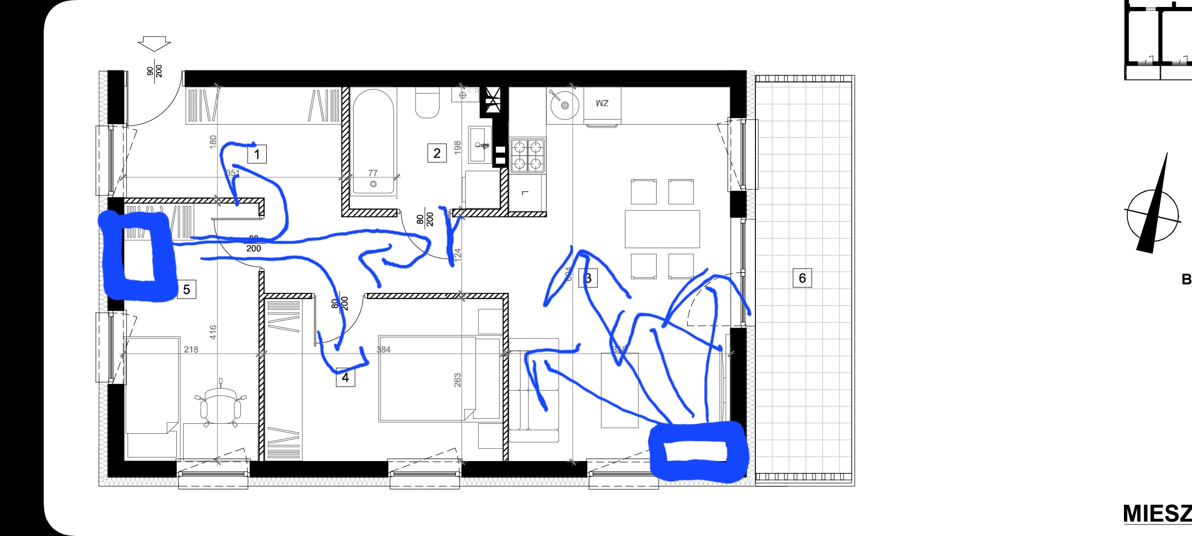 Czy takie rozmieszczenie jak na screenie ma rację bytu? Chce też mieć schłodzona sypialnie (4), poprzez np otworzenie drzwi do łazienki żeby trochę odbijały, bo w salonie będzie druga jednostka wewnętrzna.