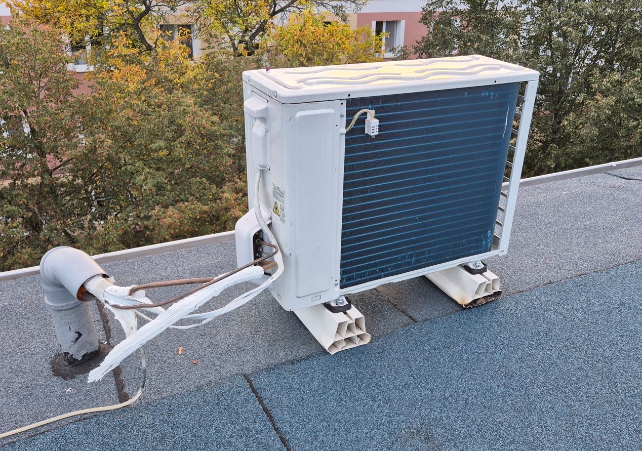 mam na dachu swojego bloku zamontowaną jednostkę zewnętrzną klimatyzatora. Obawiam się tylko o jej sposób montażu - jestem w stanie bezproblemowo poruszyć / podnieść ten klimatyzator, nie jest on w jakikolwiek sposób przymocowany / podklejony do papy. Czy taki montaż jak na zdjęciu jest poprawny, czy trzeba to jakoś wzmocnić?