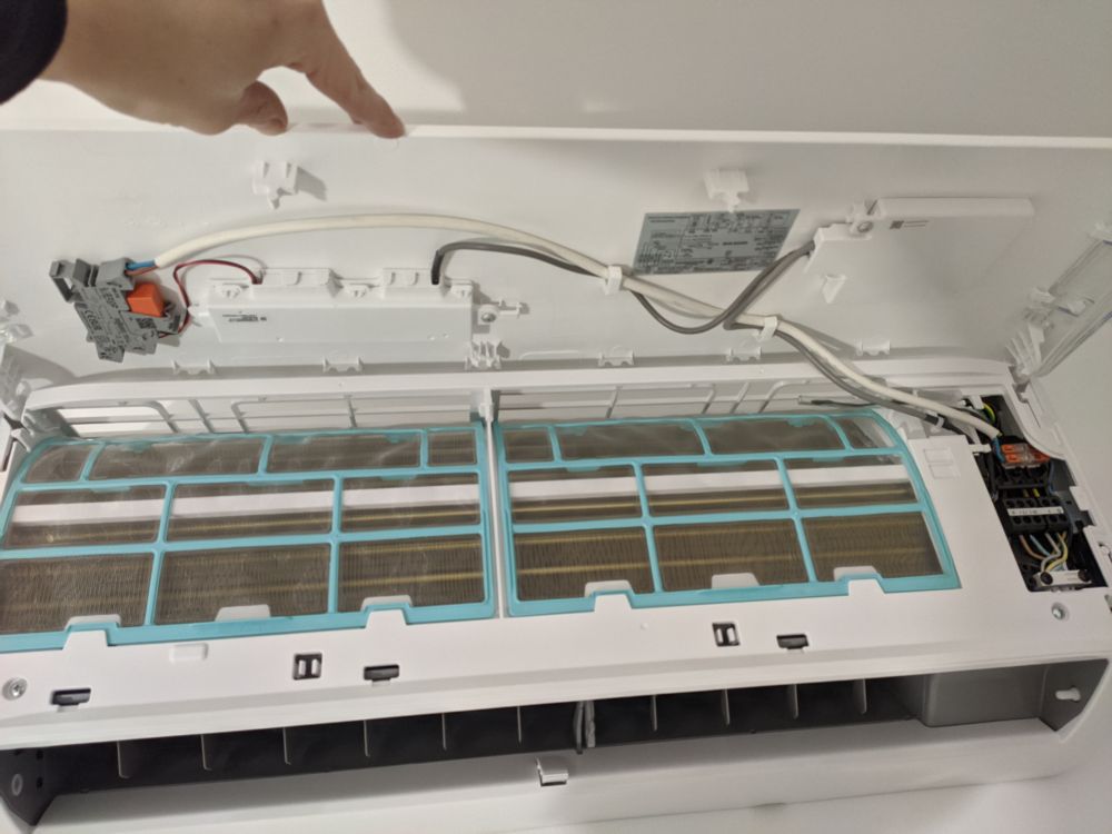 Jedyne urozmaicenie ponadstandardowe to moduły MFBR, które rozłączają jednostki wewnętrzne przez styk karty hotelowej. Z gniazda elektrycznego idzie zasilanie do przekaźnika 230V i dalej przekaźnik zwiera styk MFBR. Przekaźnik schowany pod pokrywą parownika.